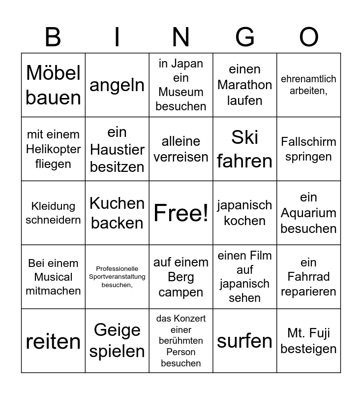 This bingo card has a free space and 24 words: Professionelle Sportveranstaltung besuchen,, Geige spielen, alleine verreisen, reiten, ehrenamtlich arbeiten,, Möbel bauen, mit einem Helikopter fliegen, angeln, japanisch kochen, auf einem Berg campen, Ski fahren, Kleidung schneidern, einen Film auf japanisch sehen, ein Fahrrad reparieren, ein Haustier besitzen, surfen, ein Aquarium besuchen, in Japan ein Museum besuchen, Fallschirm springen, Kuchen backen, Mt. Fuji besteigen, Bei einem Musical mitmachen, einen Marathon laufen and das Konzert einer berühmten Person besuchen.