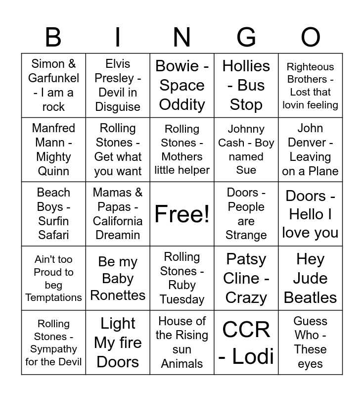 This bingo card has a free space and 39 words: Van Morrison - Brown eyed girl, The Who - Pinball wizard, Soul Man Sam and Dave, Rolling Stones - Get what you want, Rolling Stones - Sympathy for the Devil, Rolling Stones - Ruby Tuesday, Rolling Stones - Mothers little helper, Rolling Stones - Satisfaction, Righteous Brothers - Lost that lovin feeling, Ain't too Proud to beg Temptations, Mamas & Papas - California Dreamin, Hollies - Bus Stop, Guess Who - These eyes, Doors - Hello I love you, Doors - People are Strange, Be my Baby Ronettes, Simon & Garfunkel - Mrs. Robinson, Simon & Garfunkel - I am a rock, Beatles I saw her standing there, Patsy Cline - Crazy, Manfred Mann - Mighty Quinn, House of the Rising sun Animals, Johnny Cash - Boy named Sue, John Denver - Leaving on a Plane, Jimi Hendrix - Hey Joe, Jimi Hendrix - Purple Haze, Janis Joplin - Piece of my heart, You really got me Kinks, Frankie Valli - Sherry, Elvis Presley - Devil in Disguise, Diana Ross - Love Child, Diana Ross - Stop in the name of love, Bowie - Space Oddity, Light My fire Doors, CCR - Lodi, My Girl Temptetions, Hey Jude Beatles, Beach Boys - Surfin Safari and RESPECT Aretha Franklin.