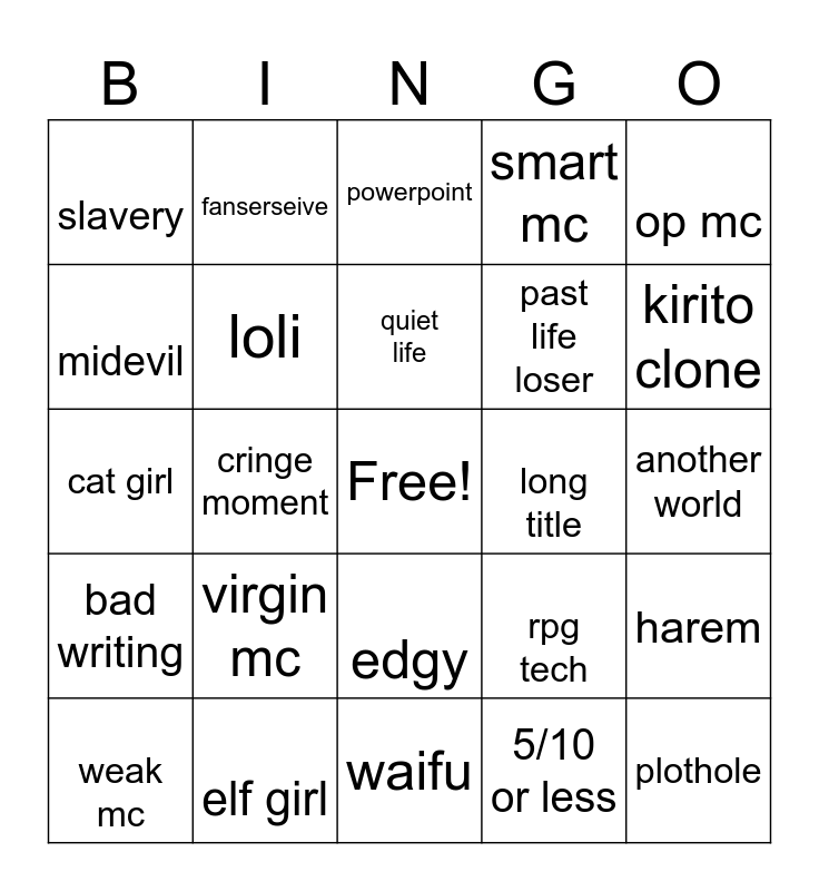 This bingo card has a free space and 24 words: virgin mc, elf girl, quiet life, weak mc, op mc, slavery, midevil, fanserseive, long title, edgy, past life loser, cat girl, rpg tech, harem, loli, 5/10 or less, another world, powerpoint, kirito clone, cringe moment, plothole, bad writing, smart mc and waifu.