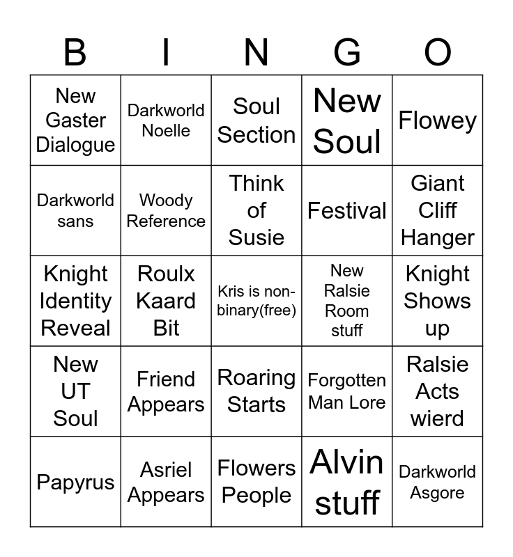 This bingo card has a free space and 24 words: Friend Appears, Asriel Appears, Think of Susie, Papyrus, Flowey, New Gaster Dialogue, Darkworld sans, Darkworld Noelle, New Ralsie Room stuff, Roaring Starts, Festival, Knight Identity Reveal, Forgotten Man Lore, Ralsie Acts wierd, Woody Reference, Alvin stuff, Knight Shows up, Soul Section, Giant Cliff Hanger, Roulx Kaard Bit, Darkworld Asgore, New UT Soul, New Soul and Flowers People.