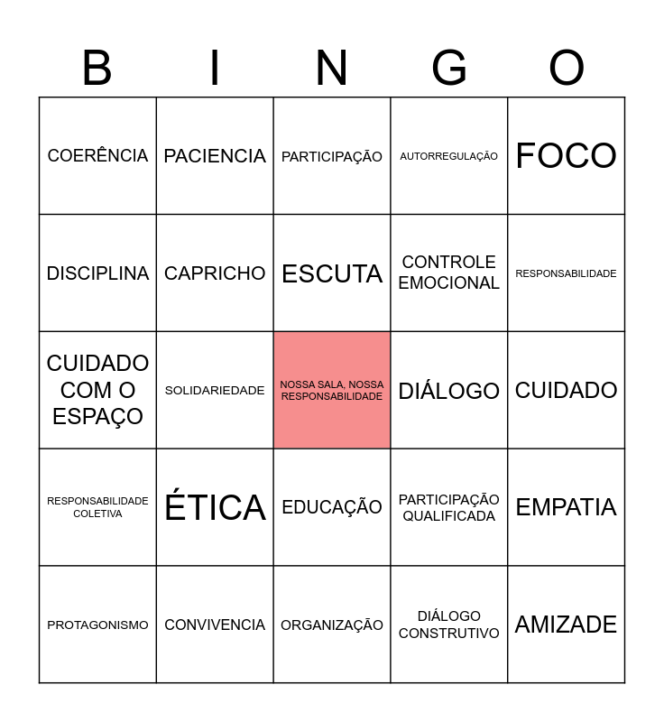 This bingo card has a free space and 40 words: GENTILEZA, CUIDADO COM O ESPAÇO, CONCIENCIA, CAPRICHO, CONVIVENCIA, EDUCAÇÃO, ESCUTA, LIMITE, FOCO, RESPONSABILIDADE COLETIVA, SOLIDARIEDADE, AUTORREGULAÇÃO, AMIZADE, CUIDADO, DIÁLOGO, ÉTICA, PONTUALIDADE, COERÊNCIA, AUTO CONTROLE, PARTICIPAÇÃO, EMPATIA, DIÁLOGO CONSTRUTIVO, CONTROLE EMOCIONAL, DISCIPLINA, GESTÃO DE TEMPO, DISCIPLINA INTERNA, COLABORAÇÃO, ESCUTA ATIVA, RESPEITO, RESPEITO AS DIFERENÇAS, PERTENCIEMNTO, PROTAGONISMO, MATURIDADE, PARTICIPAÇÃO QUALIFICADA, RESPONSABILIDADE, ORGANIZAÇÃO, AUTONOMIA, POSTURA, PACIENCIA and ATENÇÃO.