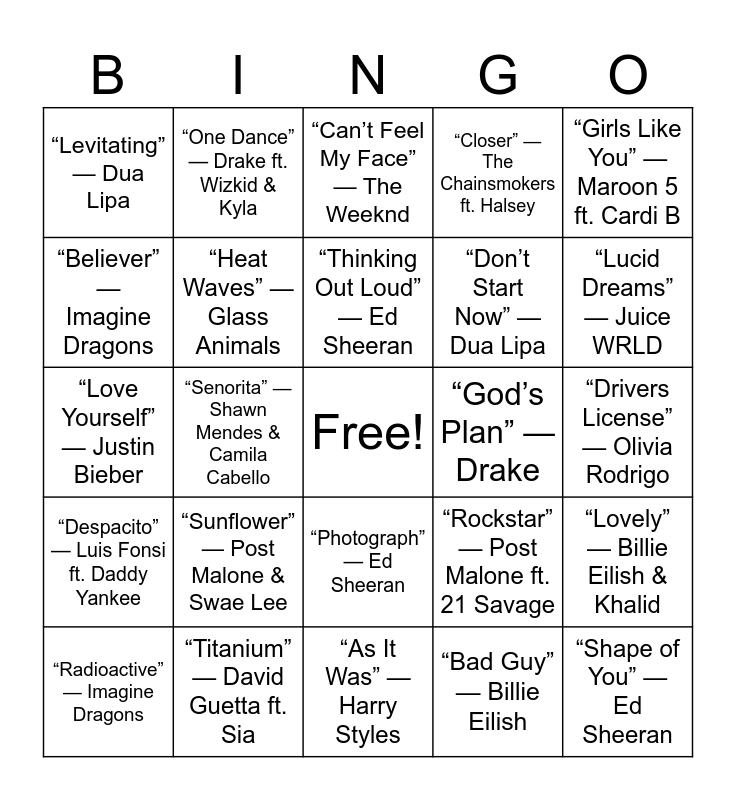 This bingo card has a free space and 50 words: “Blinding Lights” — The Weeknd, “Shape of You” — Ed Sheeran, “Starboy” — The Weeknd ft. Daft Punk, “As It Was” — Harry Styles, “Sunflower” — Post Malone & Swae Lee, “Someone You Loved” — Lewis Capaldi, “One Dance” — Drake ft. Wizkid & Kyla, “Stay” — The Kid LAROI & Justin Bieber, “Believer” — Imagine Dragons, “Dance Monkey” — Tones and I, “Heat Waves” — Glass Animals, “Closer” — The Chainsmokers ft. Halsey, “Lovely” — Billie Eilish & Khalid, “Rockstar” — Post Malone ft. 21 Savage, “Perfect” — Ed Sheeran, “Happier” — Marshmello & Bastille, “Thinking Out Loud” — Ed Sheeran, “God’s Plan” — Drake, “Circles” — Post Malone, “Girls Like You” — Maroon 5 ft. Cardi B, “Senorita” — Shawn Mendes & Camila Cabello, “Bad Guy” — Billie Eilish, “Levitating” — Dua Lipa, “Don’t Start Now” — Dua Lipa, “Watermelon Sugar” — Harry Styles, “Memories” — Maroon 5, “Lucid Dreams” — Juice WRLD, “Uptown Funk” — Mark Ronson ft. Bruno Mars, “Can’t Feel My Face” — The Weeknd, “Photograph” — Ed Sheeran, “Thunder” — Imagine Dragons, “Demons” — Imagine Dragons, “Counting Stars” — OneRepublic, “Wake Me Up” — Avicii, “Titanium” — David Guetta ft. Sia, “Shallow” — Lady Gaga & Bradley Cooper, “Flowers” — Miley Cyrus, “Anti-Hero” — Taylor Swift, “Good 4 U” — Olivia Rodrigo, “Drivers License” — Olivia Rodrigo, “Seven” — Jungkook ft. Latto, “Stay With Me” — Sam Smith, “Let Her Go” — Passenger, “Riptide” — Vance Joy, “Radioactive” — Imagine Dragons, “Love Yourself” — Justin Bieber, “Roar” — Katy Perry, “Blank Space” — Taylor Swift, “Despacito” — Luis Fonsi ft. Daddy Yankee and “Havana” — Camila Cabello ft. Young Thug.