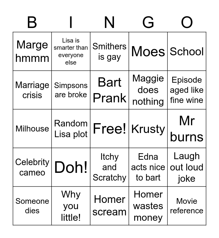 This bingo card has a free space and 24 words: Doh!, Why you little!, Bart Prank, Someone dies, School, Marge hmmm, Marriage crisis, Lisa is smarter than everyone else, Krusty, Itchy and Scratchy, Maggie does nothing, Milhouse, Edna acts nice to bart, Laugh out loud joke, Simpsons are broke, Homer wastes money, Mr burns, Smithers is gay, Episode aged like fine wine, Random Lisa plot, Movie reference, Celebrity cameo, Moes and Homer scream.
