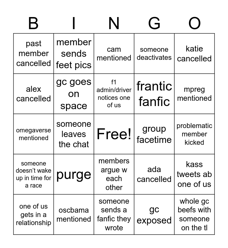 This bingo card has a free space and 24 words: purge, oscbama mentioned, f1 admin/driver notices one of us, one of us gets in a relationship, katie cancelled, past member cancelled, alex cancelled, member sends feet pics, group facetime, members argue w each other, frantic fanfic, omegaverse mentioned, ada cancelled, kass tweets ab one of us, gc goes on space, gc exposed, problematic member kicked, cam mentioned, mpreg mentioned, someone leaves the chat, whole gc beefs with someone on the tl, someone doesn’t wake up in time for a race, someone deactivates and someone sends a fanfic they wrote.