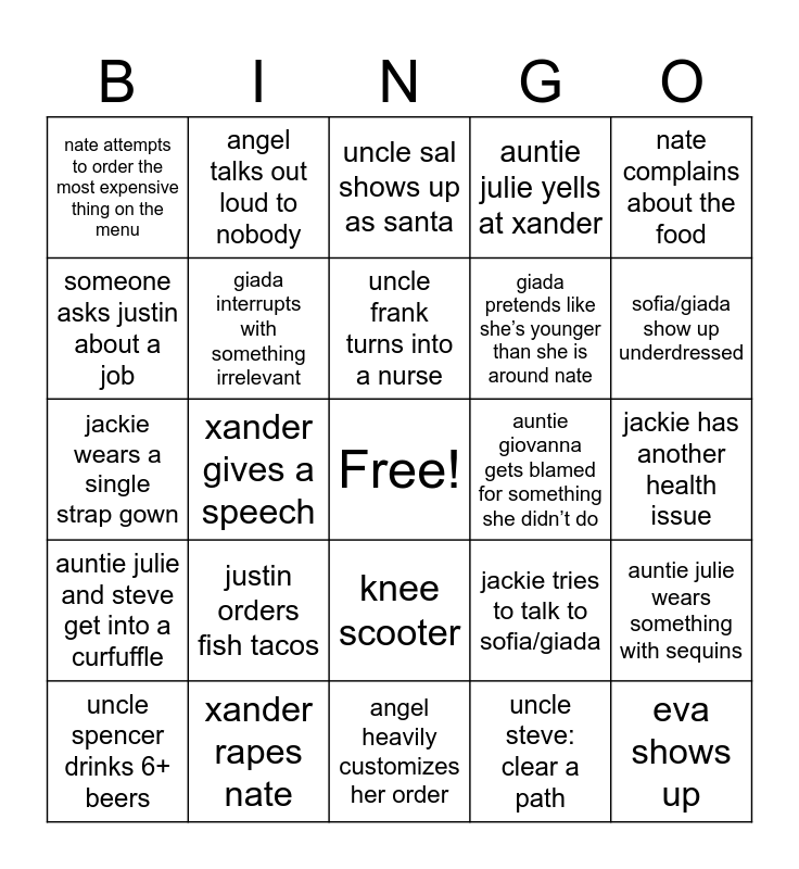 This bingo card has a free space and 26 words: knee scooter, uncle steve: clear a path, uncle frank turns into a nurse, xander rapes nate, nate complains about the food, nate attempts to order the most expensive thing on the menu, someone asks justin about a job, angel talks out loud to nobody, jackie has another health issue, jackie tries to talk to sofia/giada, giada pretends like she’s younger than she is around nate, jackie wears a single strap gown, auntie julie wears something with sequins, uncle spencer drinks 6+ beers, xander gives a speech, xander rapes justin, auntie julie yells at xander, auntie julie and steve get into a curfuffle, uncle sal shows up as santa, eva shows up, sofia/giada show up underdressed, angel heavily customizes her order, auntie giovanna gets blamed for something she didn’t do, justin orders fish tacos, giada interrupts with something irrelevant and grandpa tries to pay.