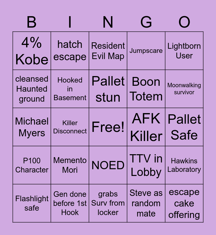 This bingo card has a free space and 24 words: Memento Mori, Gen done before 1st Hook, Pallet stun, Flashlight safe, Lightborn User, 4% Kobe, cleansed Haunted ground, hatch escape, AFK Killer, NOED, Boon Totem, Michael Myers, TTV in Lobby, Hawkins Laboratory, Hooked in Basement, Steve as random mate, Pallet Safe, Resident Evil Map, Moonwalking survivor, Killer Disconnect, escape cake offering, P100 Character, Jumpscare and grabs Surv from locker.