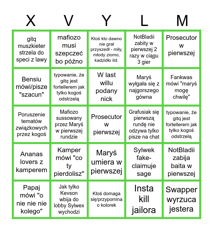 This bingo card has a free space and 26 words: Maryś umiera w pierwszej, Insta kill jailora, W last willu podany nick, Jak tylko Kevson wbija do lobby Sylwex wychodzi, Prosecutor w pierwszej, gitq muszkieter strzela do speci z lawy, Bensiu mówi/pisze "szacun", mafiozo musi szepczeć bo późno, typowanie, że gitq jest fortellerem jak tylko kogoś odstrzelą, Sylwek fake-claimuje sage, Maryś wyłgała się z najgorszego gówna, Poruszenie tematów związkowych przez kogoś, NotBladii zabija baita w pierwszej, Papaj mówi "o nie nie nie kolego", Mafiozo sussowany przez Maryś w pierwszej rundzie, Miaucieko nazywa marte mamą/Marta nazywa maćka Synkiem, NotBladii zabity w pierwszej 2 razy w ciągu 3 gier, Ananas lovers z kamperem, Ktoś kto dawno nie grał przyszedł - miły, młody ziomo, kadzidło itd., Swapper wyrzuca jestera, Fankwas mówi "maryś mogę chwilę", Ktoś domaga się/przypomina o kolorek, Grafusiak się pierwszą rundę nie odzywa tylko pisze na chat, Kamper mówi "co ty pierdolisz", typowanie, że gitq jest fortellerem jak tylko kogoś odstrzelą and Papaj mówi "o nie nie nie kolego".