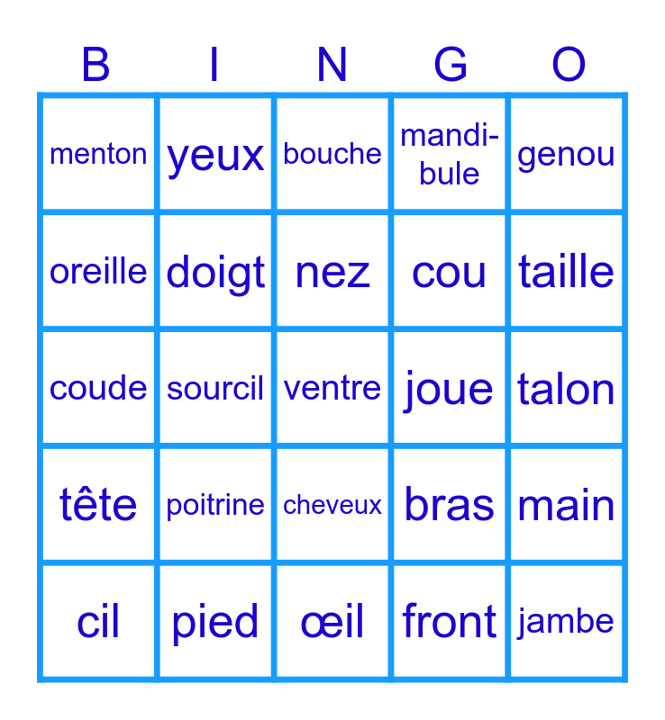 This bingo card has 25 words: poitrine, œil, nez, cil, genou, menton, oreille, yeux, joue, cheveux, cou, coude, bras, main, doigt, jambe, talon, bouche, taille, sourcil, ventre, pied, tête, mandi-bule and front.