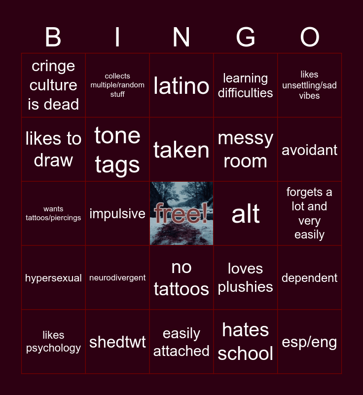 This bingo card has a free space and 24 words: neurodivergent, shedtwt, taken, likes psychology, likes unsettling/sad vibes, cringe culture is dead, likes to draw, collects multiple/random stuff, alt, no tattoos, messy room, wants tattoos/piercings, loves plushies, dependent, tone tags, hates school, forgets a lot and very easily, latino, avoidant, impulsive, esp/eng, hypersexual, learning difficulties and easily attached.