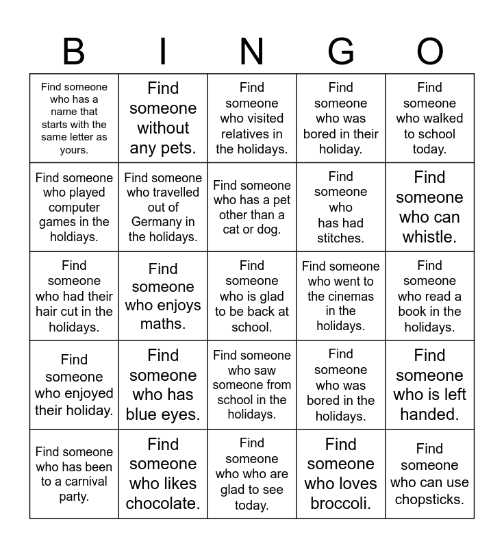 This bingo card has a free space and 24 words: Find someone who has blue eyes., Find someone who likes chocolate., Find someone who has a pet other than a cat or dog., Find someone who has been to a carnival party., Find someone who walked to school today., Find someone who has a name that starts with the same letter as yours., Find someone who played computer games in the holdiays., Find someone without any pets., Find someone who went to the cinemas in the holidays., Find someone who saw someone from school in the holidays., Find someone who has had stitches., Find someone who had their hair cut in the holidays., Find someone who was bored in the holidays., Find someone who is left handed., Find someone who travelled out of Germany in the holidays., Find someone who loves broccoli., Find someone who read a book in the holidays., Find someone who visited relatives in the holidays., Find someone who can whistle., Find someone who enjoys maths., Find someone who can use chopsticks., Find someone who enjoyed their holiday., Find someone who was bored in their holiday. and Find someone who who are glad to see today..