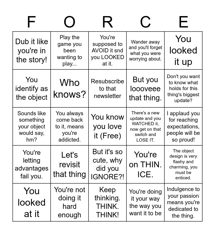 This bingo card has a free space and 24 words: Let's revisit that thing, You're not doing it hard enough, Resubscribe to that newsletter, You looked at it, You looked it up, Dub it like you're in the story!, You identify as the object, Play the game you been wanting to play..., There's a new update and you WATCHED it, now get on that switch and LOSE IT., But it's so cute, why did you IGNORE?!, But you loooveee that thing., Sounds like something your object would say, hm?, You're on THIN. ICE., The object design is very flashy and charming, you must be enticed., Who knows?, You're doing it your way the way you want it to be, I applaud you for reaching expectations, people will be so proud!, You're supposed to AVOID it snd you LOOKED at it., Don't you want to know what holds for this thing's biggest update?, You always come back to it, means you're addicted., Indulgence to your passion means you're dedicated to the thing., You're letting advantages fail you., Wander away and you'll forget what you were worrying about. and Keep thinking. THINK. THINK!.