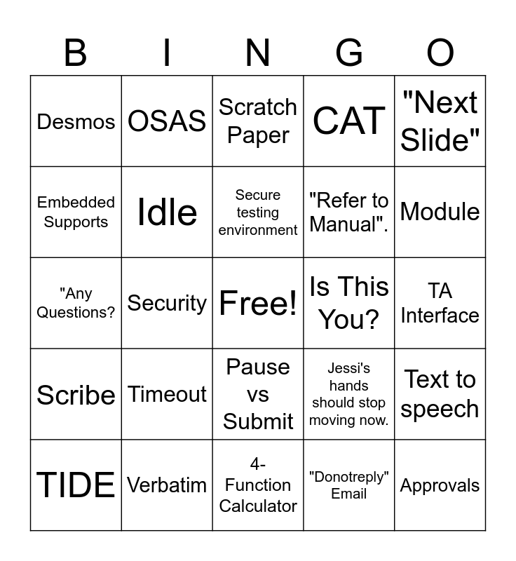 This bingo card has a free space and 29 words: TIDE, "A lot of info", Security, Impropriety, Desmos, Scratch Paper, Idle, Timeout, Is This You?, Verbatim, TA Interface, Approvals, 4-Function Calculator, "Donotreply" Email, Module, Table, Pause vs Submit, Scribe, "Next Slide", "Any Questions?, Jessi's hands should stop moving now., Testing Window, "Refer to Manual"., Embedded Supports, CAT, OSAS, Text to speech, Secure testing environment and Universal Supports.