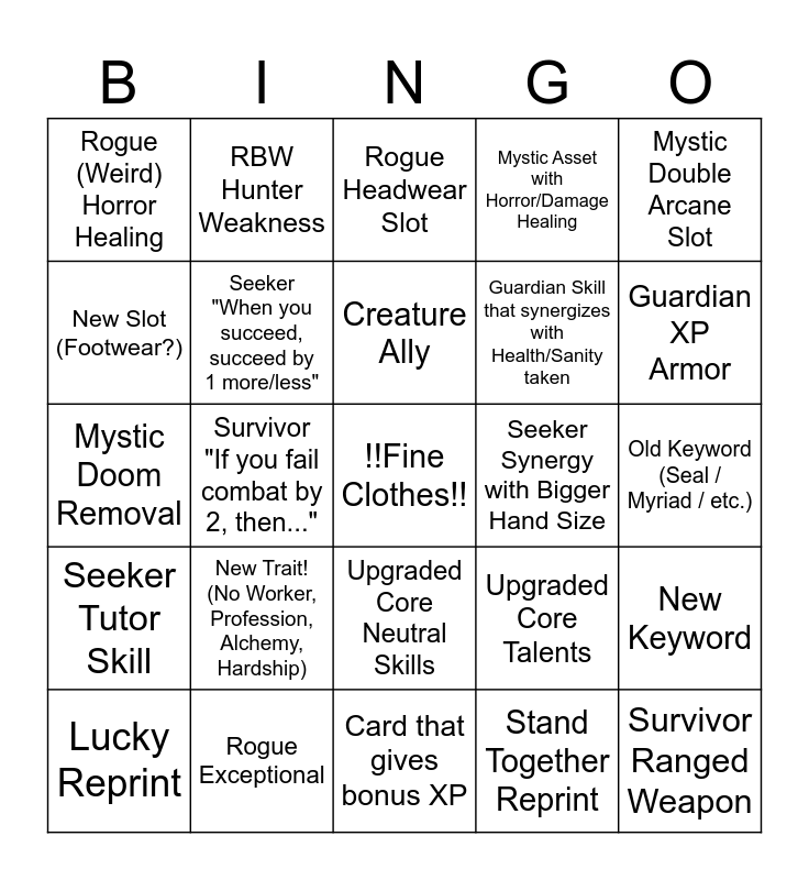 This bingo card has a free space and 24 words: New Trait! (No Worker, Profession, Alchemy, Hardship), Rogue Exceptional, Creature Ally, Lucky Reprint, Mystic Double Arcane Slot, Rogue (Weird) Horror Healing, New Slot (Footwear?), RBW Hunter Weakness, Seeker Synergy with Bigger Hand Size, Upgraded Core Neutral Skills, Guardian Skill that synergizes with Health/Sanity taken, Mystic Doom Removal, Upgraded Core Talents, New Keyword, Seeker "When you succeed, succeed by 1 more/less", Stand Together Reprint, Old Keyword (Seal / Myriad / etc.), Rogue Headwear Slot, Guardian XP Armor, Survivor "If you fail combat by 2, then...", Survivor Ranged Weapon, Seeker Tutor Skill, Mystic Asset with Horror/Damage Healing and Card that gives bonus XP.