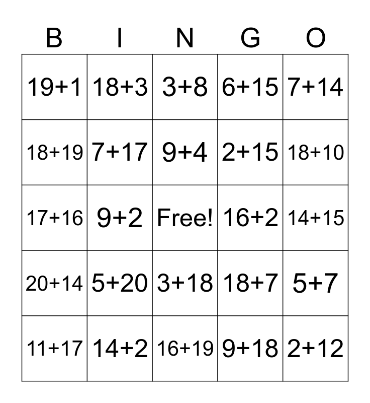 This bingo card has a free space and 30 words: 14+2, 16+13, 9+2, 6+15, 19+1, 3+8, 7+17, 3+18, 16+2, 16+19, 14+15, 2+12, 9+18, 5+8, 18+10, 2+3, 18+7, 20+14, 5+20, 7+14, 17+16, 19+15, 18+3, 2+15, 18+19, 6+15, 5+7, 11+17, 9+4 and 3+19.