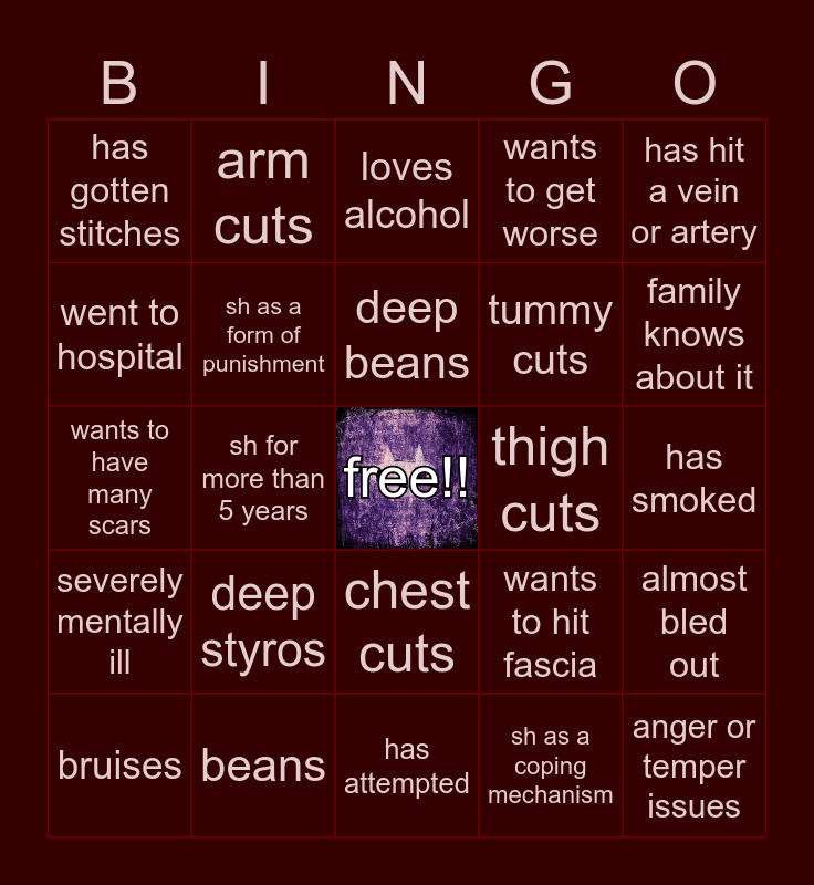 This bingo card has a free space and 24 words: deep styros, beans, deep beans, bruises, has hit a vein or artery, has gotten stitches, went to hospital, arm cuts, thigh cuts, chest cuts, tummy cuts, wants to have many scars, wants to hit fascia, almost bled out, sh as a form of punishment, sh as a coping mechanism, has smoked, loves alcohol, family knows about it, sh for more than 5 years, anger or temper issues, severely mentally ill, wants to get worse and has attempted.
