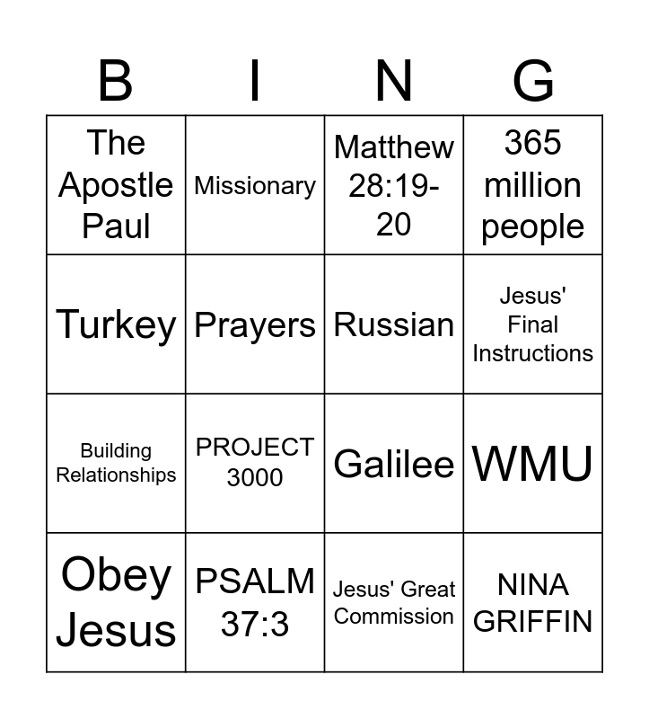This bingo card has 18 words: PROJECT 3000, NINA GRIFFIN, Matthew 28:19-20, The Apostle Paul, Galilee, 365 million people, Obey Jesus, Missionary, Jesus' Final Instructions, Building Relationships, Jesus' Great Commission, Turkey, WMU, Prayers, Russian, 1 out of every 10,000 people, PSALM 37:3 and Teacher.