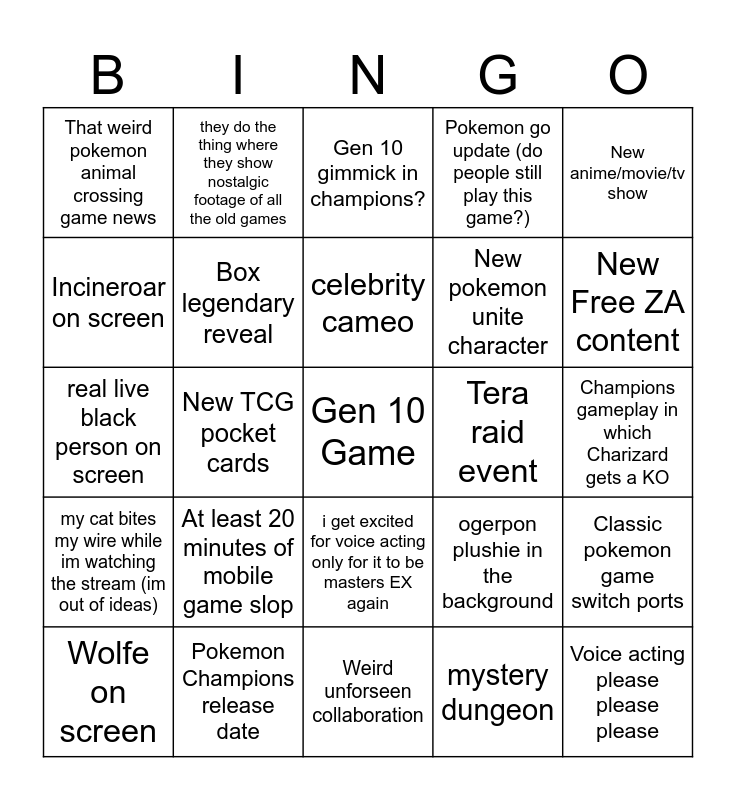 This bingo card has a free space and 24 words: At least 20 minutes of mobile game slop, Pokemon Champions release date, celebrity cameo, Wolfe on screen, New anime/movie/tv show, That weird pokemon animal crossing game news, Incineroar on screen, they do the thing where they show nostalgic footage of all the old games, Tera raid event, i get excited for voice acting only for it to be masters EX again, New pokemon unite character, real live black person on screen, ogerpon plushie in the background, Classic pokemon game switch ports, Box legendary reveal, mystery dungeon, Champions gameplay in which Charizard gets a KO, Gen 10 gimmick in champions?, New Free ZA content, New TCG pocket cards, Voice acting please please please, my cat bites my wire while im watching the stream (im out of ideas), Pokemon go update (do people still play this game?) and Weird unforseen collaboration.