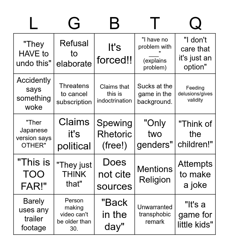 This bingo card has a free space and 24 words: "They just THINK that", Person making video can't be older than 30., Claims that this is indoctrination, Barely uses any trailer footage, "I don't care that it's just an option", "They HAVE to undo this", Accidently says something woke, Refusal to elaborate, "Only two genders", Does not cite sources, Sucks at the game in the background., "Ther Japanese version says OTHER", Mentions Religion, Attempts to make a joke, Threatens to cancel subscription, Unwarranted transphobic remark, "Think of the children!", It's forced!!, Feeding delusions/gives validity, Claims it's political, "It's a game for little kids", "This is TOO FAR!", "I have no problem with ___" (explains problem) and "Back in the day".