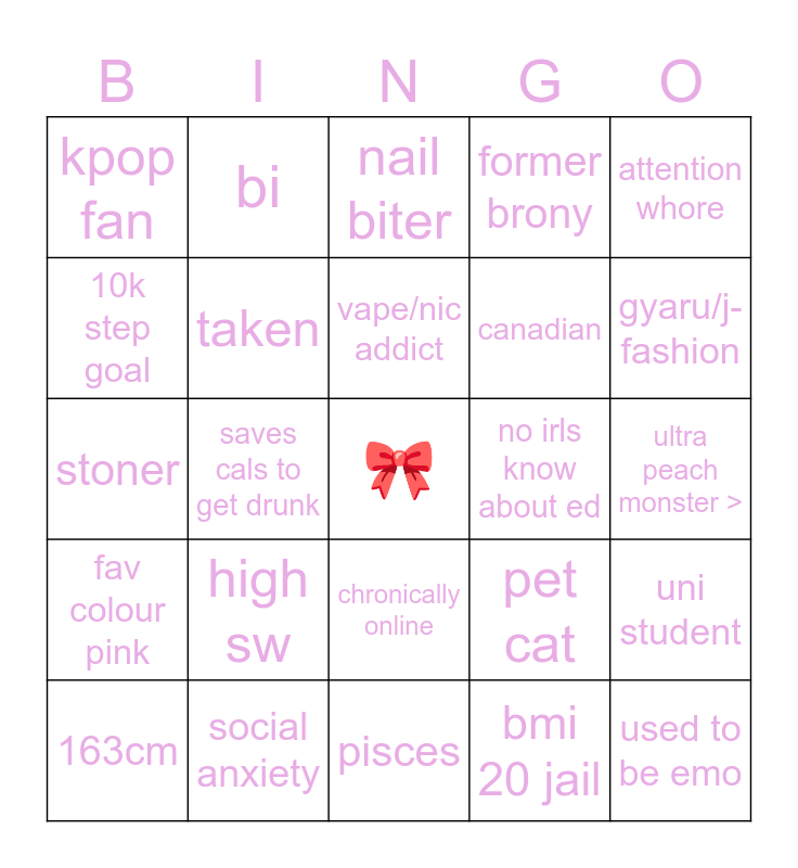 This bingo card has a free space and 24 words: high sw, social anxiety, vape/nic addict, 163cm, attention whore, kpop fan, 10k step goal, bi, no irls know about ed, chronically online, canadian, stoner, pet cat, uni student, taken, bmi 20 jail, ultra peach monster >, nail biter, gyaru/j-fashion, saves cals to get drunk, used to be emo, fav colour pink, former brony and pisces.