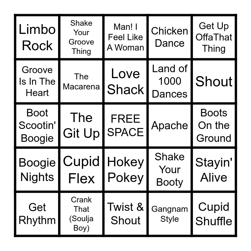 This bingo card has a free space and 43 words: Cha Cha Slide, Cupid Shuffle, U Can't Touch This, Get Rhythm, Watch Me (Whip/Nae Nae), Gangnam Style, Man! I Feel Like A Woman, YMCA, Get Up OffaThat Thing, Crank That (Soulja Boy), Chicken Dance, Apache, Hokey Pokey, Cupid Flex, The Twist, Twist & Shout, The Electric Slide, Boot Scootin' Boogie, The Loco-Motion, Shout, Shake Your Groove Thing, C'mon Ride It (The Train), The Hustle, Limbo Rock, Cotton Eye Joe, Boots On the Ground, Dancing Queen, Uptown Funk, Shake Your Booty, Boogie Nights, Play That Funky Music, Stayin' Alive, Conga, The Git Up, Pump Up the Jam, Turn the Beat Around, Push It, Love Shack, Groove Is In The Heart, Land of 1000 Dances, Single Ladies, The Macarena and Shake It Off.