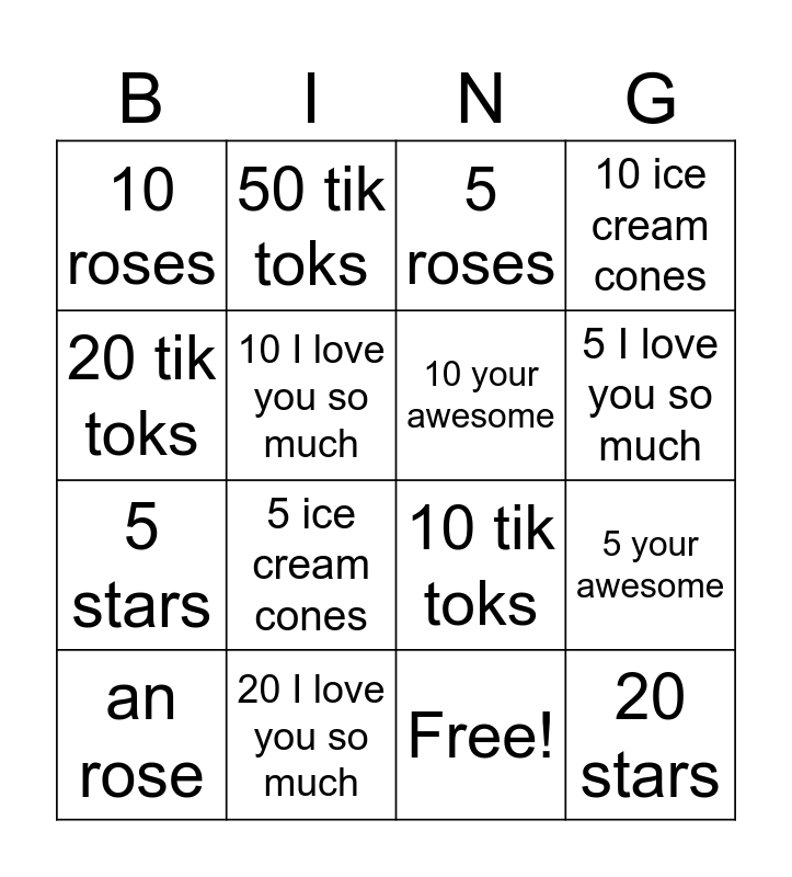 This bingo card has 17 words: Free!, an rose, 5 roses, 10 roses, 5 ice cream cones, 10 ice cream cones, 5 your awesome, 10 your awesome, 5 I love you so much, 10 I love you so much, 20 I love you so much, 10 tik toks, 20 tik toks, 50 tik toks, 5 stars, 10 stars and 20 stars.