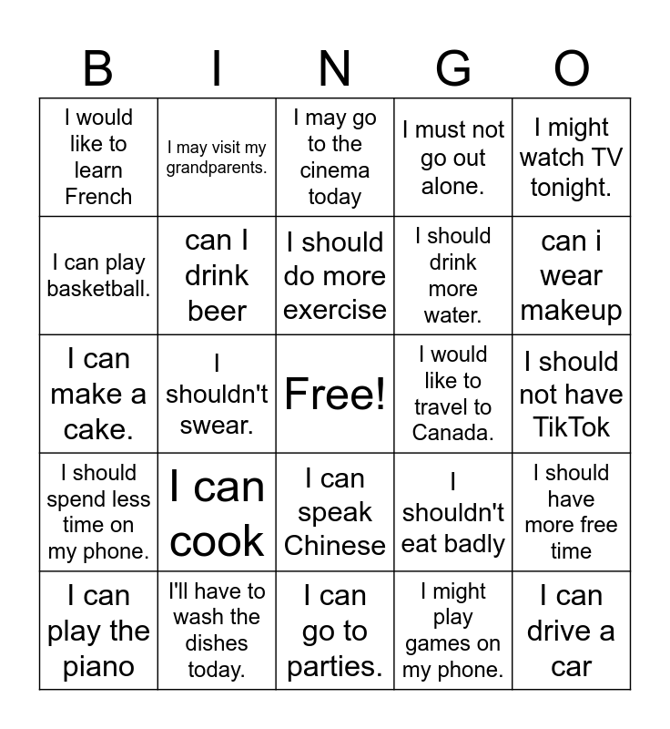 This bingo card has a free space and 24 words: I can cook, I'll have to wash the dishes today., I should do more exercise, I can play the piano, I might watch TV tonight., I would like to learn French, I can play basketball., I may visit my grandparents., I would like to travel to Canada., I can speak Chinese, I should drink more water., I can make a cake., I shouldn't eat badly, I should have more free time, can I drink beer, I might play games on my phone., I should not have TikTok, I may go to the cinema today, can i wear makeup, I shouldn't swear., I can drive a car, I should spend less time on my phone., I must not go out alone. and I can go to parties..