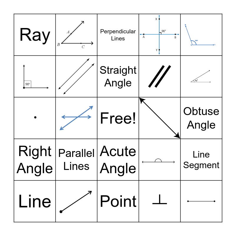 This bingo card has 14 images, a free space and 10 words: Parallel Lines, Straight Angle, Line, Ray, Acute Angle, Line Segment, Obtuse Angle, Perpendicular Lines, Right Angle and Point.