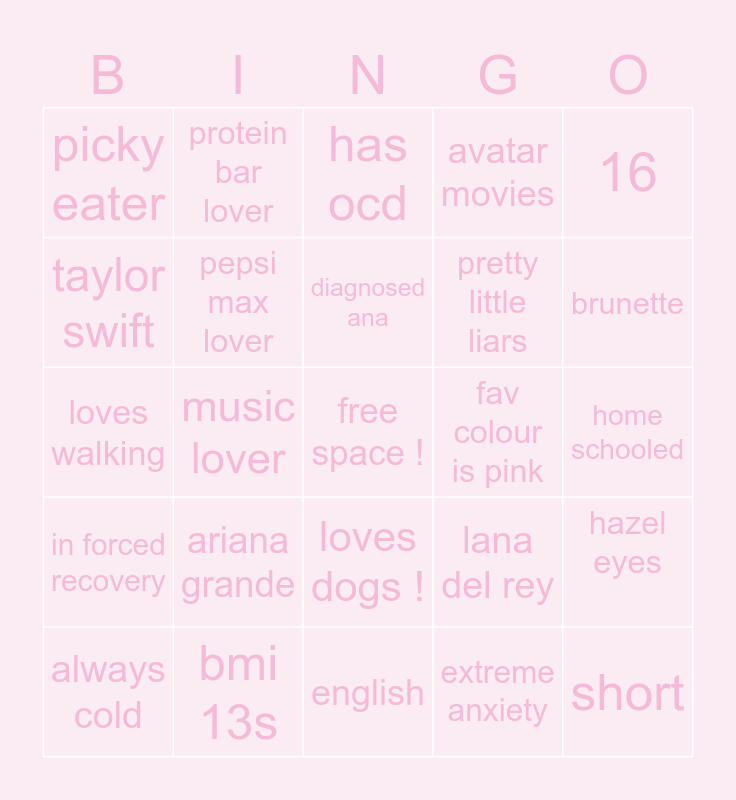 This bingo card has a free space and 24 words: ariana grande, bmi 13s, diagnosed ana, always cold, 16, picky eater, taylor swift, protein bar lover, fav colour is pink, loves dogs !, pretty little liars, loves walking, lana del rey, hazel eyes, pepsi max lover, extreme anxiety, home schooled, has ocd, brunette, music lover, short, in forced recovery, avatar movies and english.