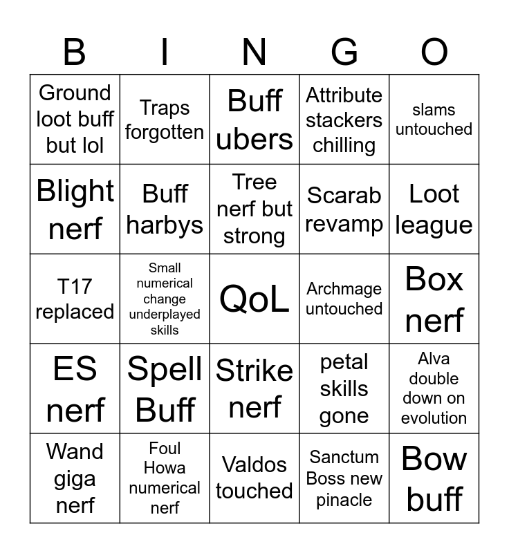 This bingo card has a free space and 24 words: Spell Buff, Foul Howa numerical nerf, Tree nerf but strong, Wand giga nerf, slams untouched, Ground loot buff but lol, Blight nerf, Traps forgotten, Archmage untouched, Strike nerf, Scarab revamp, T17 replaced, petal skills gone, Alva double down on evolution, Buff harbys, Sanctum Boss new pinacle, Box nerf, Buff ubers, Loot league, Small numerical change underplayed skills, Bow buff, ES nerf, Attribute stackers chilling and Valdos touched.