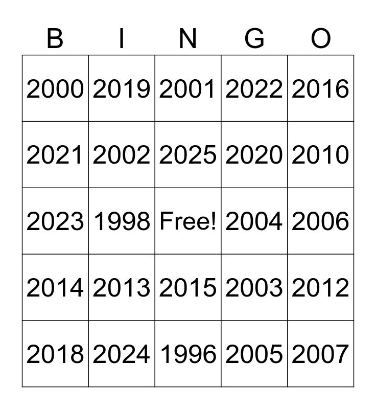 This bingo card has a free space and 31 words: 1996, 1997, 1998, 1999, 2000, 2001, 2002, 2003, 2004, 2005, 2006, 2007, 2008, 2009, 2010, 2011, 2012, 2013, 2014, 2015, 2016, 2017, 2018, 2019, 2020, 2021, 2022, 2023, 2024, 2025 and 2026.
