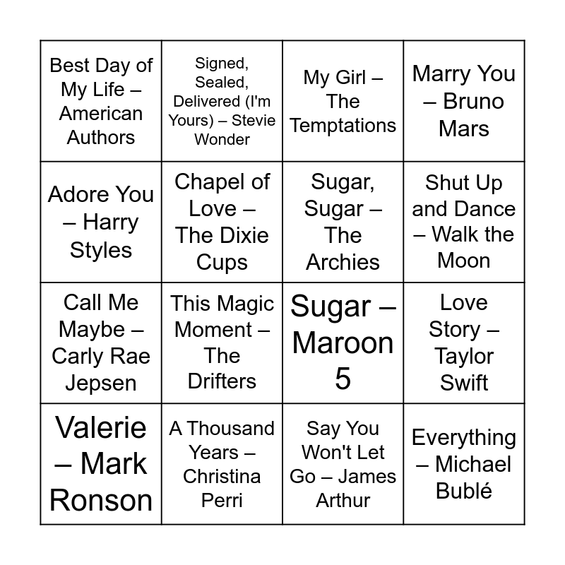 This bingo card has 35 words: Honey, Honey – ABBA, Honey I'm Good – Andy Grammer, Honey Bee – Blake Shelton, Sugar, Sugar – The Archies, Love on Top – Beyoncé, Marry You – Bruno Mars, Chapel of Love – The Dixie Cups, You Make My Dreams – Hall & Oates, Shut Up and Dance – Walk the Moon, I Wanna Dance with Somebody – Whitney Houston, Sugar – Maroon 5, Adore You – Harry Styles, Can't Stop the Feeling! – Justin Timberlake, This Will Be (An Everlasting Love) – Natalie Cole, Best Day of My Life – American Authors, A Thousand Years – Christina Perri, Speechless – Dan + Shay, Love Story – Taylor Swift, Everything – Michael Bublé, Valerie – Mark Ronson, Be My Baby – The Ronnettes, Baby Love – The Supremes, Perfect – Ed Sheeran, I'm Yours – Jason Mraz, My Girl – The Temptations, This Magic Moment – The Drifters, How Sweet It Is (To Be Loved by You) – James Taylor, Love You Like a Love Song – Selena Gomez, Call Me Maybe – Carly Rae Jepsen, Say You Won't Let Go – James Arthur, Then He Kissed Me – The Crystals, You Are the Best Thing – Ray LaMontagne, Lucky – Colbie Caillat, Signed, Sealed, Delivered (I'm Yours) – Stevie Wonder and Burning Love – Elvis Presley.