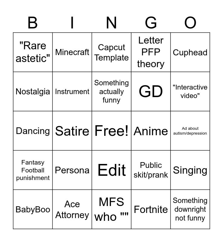 This bingo card has a free space and 24 words: Persona, Ace Attorney, Something actually funny, BabyBoo, Cuphead, "Rare astetic", Nostalgia, Minecraft, Anime, Edit, GD, Dancing, Public skit/prank, Singing, Instrument, Fortnite, Ad about autism/depression, Capcut Template, "Interactive video", Satire, Something downright not funny, Fantasy Football punishment, Letter PFP theory and MFS who "".