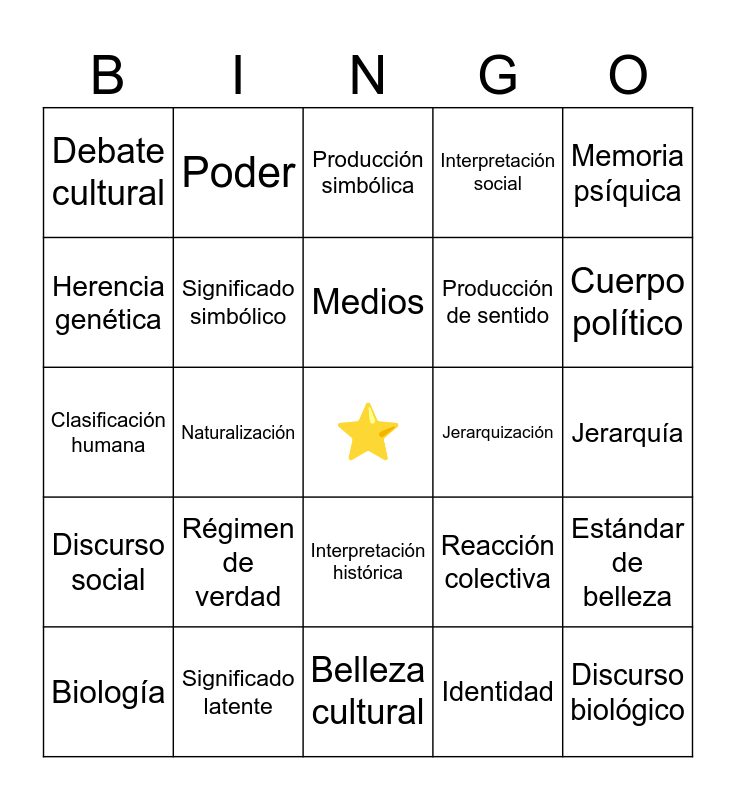 This bingo card has a free space and 49 words: Inconsciente, Discurso biológico, Normalización, Belleza cultural, Régimen de verdad, Latente, Poder, Representación corporal, Herencia genética, Construcción social, Significado simbólico, Interpretación social, Estándar de belleza, Reacción colectiva, Deseo, Clasificación humana, Medios, Jerarquización, Recepción activa, Memoria psíquica, Naturalización, Identidad, Debate cultural, Producción de sentido, Deseo, Cuerpo político, Biología, Estándar normativo, Interpretación histórica, Discurso social, Cultura visual, Poder disciplinado, Genética simbólica, Recepción cultural, Significado latente, Representación, ⭐️, Construcción del sentido, Jerarquía, Naturalización estética, Identidad social, Medios digitales, Subjetividad, Sistema inconsciente, Clasificación humana, Producción simbólica, Debate público, Ideología corporal and Regulación social.