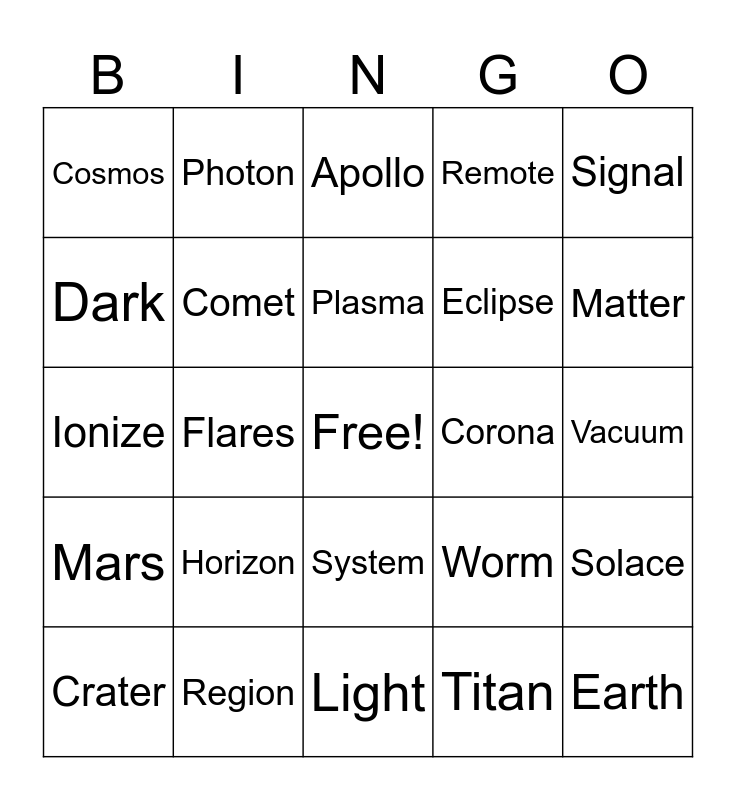 This bingo card has a free space and 85 words: Aether, Alien, Apollo, Astro, Aurora, Beacon, Binary, Black, Carbon, Capsule, Celest, Ceres, Comet, Corona, Cosmic, Cosmos, Crater, Dark, Debris, Deep, Dwarf, Eclipse, Earth, Energy, Flares, Fusion, Galaxy, Gamma, Helium, Hole, Horizon, Impact, Infra, Ionize, Lander, Launch, Light, Lunar, Mars, Matter, Meteor, Module, Nebrix, Nebule, Neptune, Night, Nova, Orbit, Oxygen, Parsec, Photon, Plasma, Planet, Pulsar, Quasar, Radar, Region, Remote, Rift, Rocket, Rover, Saturn, Sector, Sensor, Shuttle, Signal, Solar, Solace, Space, Spiral, Star, Static, Stellar, Strobe, Super, System, Titan, Travel, Ultra, Uranus, Vacuum, Vector, Venus, Worm and Zenith.