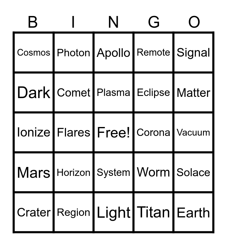 This bingo card has a free space and 85 words: Aether, Alien, Apollo, Astro, Aurora, Beacon, Binary, Black, Carbon, Capsule, Celest, Ceres, Comet, Corona, Cosmic, Cosmos, Crater, Dark, Debris, Deep, Dwarf, Eclipse, Earth, Energy, Flares, Fusion, Galaxy, Gamma, Helium, Hole, Horizon, Impact, Infra, Ionize, Lander, Launch, Light, Lunar, Mars, Matter, Meteor, Module, Nebrix, Nebule, Neptune, Night, Nova, Orbit, Oxygen, Parsec, Photon, Plasma, Planet, Pulsar, Quasar, Radar, Region, Remote, Rift, Rocket, Rover, Saturn, Sector, Sensor, Shuttle, Signal, Solar, Solace, Space, Spiral, Star, Static, Stellar, Strobe, Super, System, Titan, Travel, Ultra, Uranus, Vacuum, Vector, Venus, Worm and Zenith.