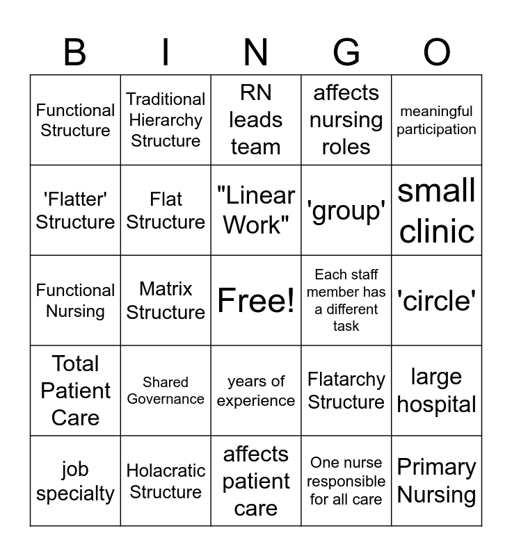 This bingo card has a free space and 27 words: Flatarchy Structure, Strong nurse-patient relationship, 'group', affects patient care, 'Flatter' Structure, RN leads team, Traditional Hierarchy Structure, Total Patient Care, Each staff member has a different task, large hospital, Functional Nursing, affects nursing roles, job specialty, Holacratic Structure, small clinic, Team Nursing, Flat Structure, "Linear Work", Shared Governance, Functional Structure, 'circle', One nurse responsible for all care, Matrix Structure, Primary Nursing, years of experience, meaningful participation and Relationship-based Care.