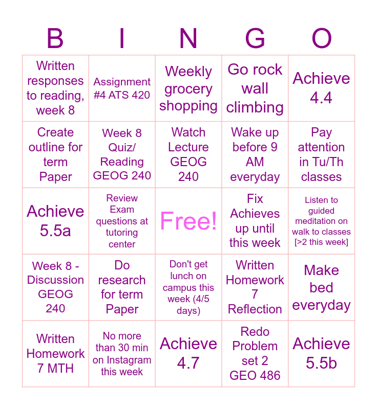 This bingo card has a free space and 24 words: Do research for term Paper, No more than 30 min on Instagram this week, Watch Lecture GEOG 240, Written Homework 7 MTH, Achieve 4.4, Written responses to reading, week 8, Create outline for term Paper, Assignment #4 ATS 420, Fix Achieves up until this week, Don't get lunch on campus this week (4/5 days), Wake up before 9 AM everyday, Achieve 5.5a, Written Homework 7 Reflection, Make bed everyday, Week 8 Quiz/ Reading GEOG 240, Redo Problem set 2 GEO 486, Listen to guided meditation on walk to classes [>2 this week], Weekly grocery shopping, Pay attention in Tu/Th classes, Review Exam questions at tutoring center, Achieve 5.5b, Week 8 - Discussion GEOG 240, Go rock wall climbing and Achieve 4.7.