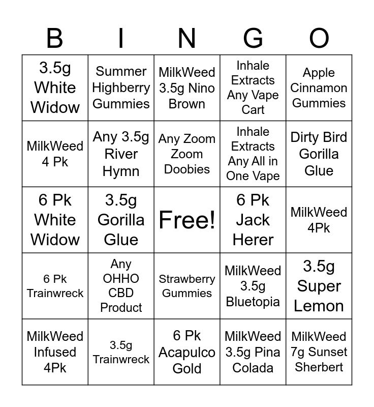 This bingo card has a free space and 61 words: MilkWeed 3.5g Pink Melonz, 3.5g Trainwreck, Any Harney Brothers Drink, 6 Pk Trainwreck, MilkWeed 3.5g Pina Colada, Any Harney Brothers Drink, Any 3.5g River Hymn, MilkWeed 3.5g Permanent Chimera, Inhale Extracts Any All in One Vape, Hibiscus Lemonade Gummies, Inhale Extracts Any Vape Cart, Sleep Gummies, MilkWeed 4 Pk, High and Mighty Any Vape Cart, Any Free Thinkers Pre Roll, 3.5g White Widow, MilkWeed 7g Sunset Sherbert, Apple Cinnamon Gummies, 6 Pk Maui Wowie, Any Zoom Zoom Doobies, 6 Pk Jack Herer, MilkWeed 3.5g Nino Brown, MilkWeed Infused 4Pk, 3.5g Super Lemon, Any 3.5g River Hymn, 6 Pk Gorilla Glue, Any Zoom Zoom Doobies, Free Thinkers Apple Fritters 28g, Dirty Bird Gorilla Glue, Free Thinkers Ice Cream Cake 28g, Sweet Salted Dark Chocolate Bar, Any 3.5g River Hymn, Dirty Bird Northern Lights, MilkWeed Nino Brown 4 Pk, Summer Highberry Gummies, 3.5g Jack Herer, MilkWeed 3.5g Catskill Candy, 3.5g Gorilla Glue, MilkWeed 3.5g Secret Weapon, 6 Pk White Widow, 3.5g Maui Wowie, Any OHHO CBD Product, MilkWeed 4Pk, MilkWeed 3.5g Lemon Cherry Gelato, MilkWeed 3.5g Bluetopia, 3.5g Acapulco Gold, MilkWeed Infused LCG 4Pk, MilkWeed 7g Lemon Cherry Gelato, Inhale Extracts Any All in One Vape, Strawberry Gummies, 6 Pk Acapulco Gold, Inhale Extracts Any Vape Cart, Any OHHO CBD Product, 3.5 g Northern Lights, Dirty Bird Super Lemon, 6 Pk Super Lemon, MilkWeed 3.5g Sour Sherbanger, MilkWeed Blutopia 4 Pk, 6 Pk Northern Lights, Any Zoom Zoom Doobies and MilkWeed 3.5g Sunset Sherbert.