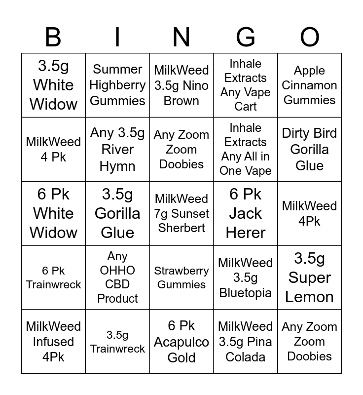 This bingo card has 61 words: MilkWeed 3.5g Pink Melonz, 3.5g Trainwreck, Any Harney Brothers Drink, 6 Pk Trainwreck, MilkWeed 3.5g Pina Colada, Any Harney Brothers Drink, Any 3.5g River Hymn, MilkWeed 3.5g Permanent Chimera, Inhale Extracts Any All in One Vape, Hibiscus Lemonade Gummies, Inhale Extracts Any Vape Cart, Sleep Gummies, MilkWeed 4 Pk, High and Mighty Any Vape Cart, Any Free Thinkers Pre Roll, 3.5g White Widow, MilkWeed 7g Sunset Sherbert, Apple Cinnamon Gummies, 6 Pk Maui Wowie, Any Zoom Zoom Doobies, 6 Pk Jack Herer, MilkWeed 3.5g Nino Brown, MilkWeed Infused 4Pk, 3.5g Super Lemon, Any 3.5g River Hymn, 6 Pk Gorilla Glue, Any Zoom Zoom Doobies, Free Thinkers Apple Fritters 28g, Dirty Bird Gorilla Glue, Free Thinkers Ice Cream Cake 28g, Sweet Salted Dark Chocolate Bar, Any 3.5g River Hymn, Dirty Bird Northern Lights, MilkWeed Nino Brown 4 Pk, Summer Highberry Gummies, 3.5g Jack Herer, MilkWeed 3.5g Catskill Candy, 3.5g Gorilla Glue, MilkWeed 3.5g Secret Weapon, 6 Pk White Widow, 3.5g Maui Wowie, Any OHHO CBD Product, MilkWeed 4Pk, MilkWeed 3.5g Lemon Cherry Gelato, MilkWeed 3.5g Bluetopia, 3.5g Acapulco Gold, MilkWeed Infused LCG 4Pk, MilkWeed 7g Lemon Cherry Gelato, Inhale Extracts Any All in One Vape, Strawberry Gummies, 6 Pk Acapulco Gold, Inhale Extracts Any Vape Cart, Any OHHO CBD Product, 3.5 g Northern Lights, Dirty Bird Super Lemon, 6 Pk Super Lemon, MilkWeed 3.5g Sour Sherbanger, MilkWeed Blutopia 4 Pk, 6 Pk Northern Lights, Any Zoom Zoom Doobies and MilkWeed 3.5g Sunset Sherbert.