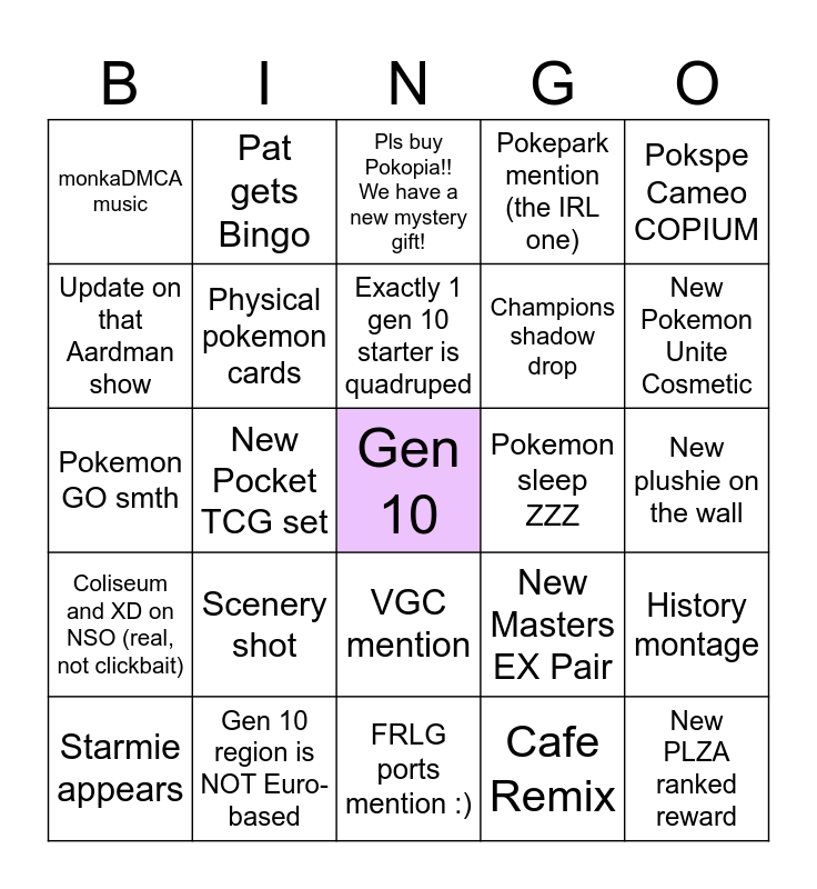 This bingo card has a free space and 24 words: Scenery shot, Gen 10 region is NOT Euro-based, Exactly 1 gen 10 starter is quadruped, Starmie appears, Pokspe Cameo COPIUM, monkaDMCA music, Update on that Aardman show, Pat gets Bingo, Pokemon sleep ZZZ, VGC mention, Champions shadow drop, Pokemon GO smth, New Masters EX Pair, History montage, Physical pokemon cards, Cafe Remix, New plushie on the wall, Pls buy Pokopia!! We have a new mystery gift!, New Pokemon Unite Cosmetic, New Pocket TCG set, New PLZA ranked reward, Coliseum and XD on NSO (real, not clickbait), Pokepark mention (the IRL one) and FRLG ports mention :).