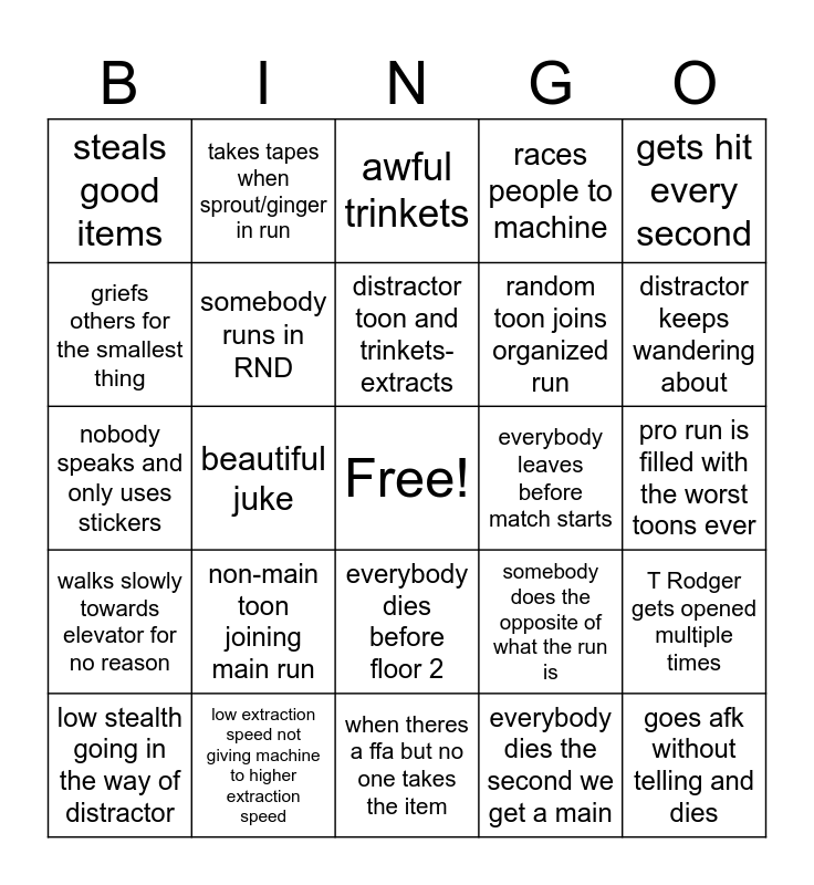 This bingo card has a free space and 24 words: non-main toon joining main run, low extraction speed not giving machine to higher extraction speed, distractor toon and trinkets-extracts, low stealth going in the way of distractor, gets hit every second, steals good items, griefs others for the smallest thing, takes tapes when sprout/ginger in run, everybody leaves before match starts, everybody dies before floor 2, random toon joins organized run, nobody speaks and only uses stickers, somebody does the opposite of what the run is, T Rodger gets opened multiple times, somebody runs in RND, everybody dies the second we get a main, pro run is filled with the worst toons ever, awful trinkets, distractor keeps wandering about, beautiful juke, goes afk without telling and dies, walks slowly towards elevator for no reason, races people to machine and when theres a ffa but no one takes the item.