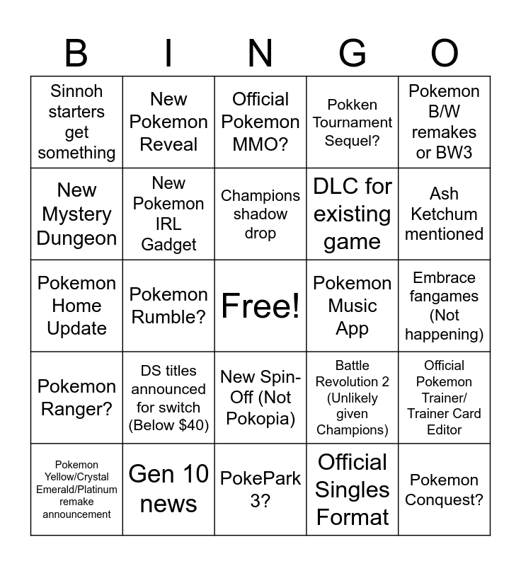 This bingo card has a free space and 24 words: DS titles announced for switch (Below $40), Gen 10 news, Champions shadow drop, Pokemon Yellow/Crystal Emerald/Platinum remake announcement, Pokemon B/W remakes or BW3, Sinnoh starters get something, New Mystery Dungeon, New Pokemon Reveal, Pokemon Music App, New Spin-Off (Not Pokopia), DLC for existing game, Pokemon Home Update, Battle Revolution 2 (Unlikely given Champions), Official Pokemon Trainer/ Trainer Card Editor, New Pokemon IRL Gadget, Official Singles Format, Embrace fangames (Not happening), Official Pokemon MMO?, Ash Ketchum mentioned, Pokemon Rumble?, Pokemon Conquest?, Pokemon Ranger?, Pokken Tournament Sequel? and PokePark 3?.