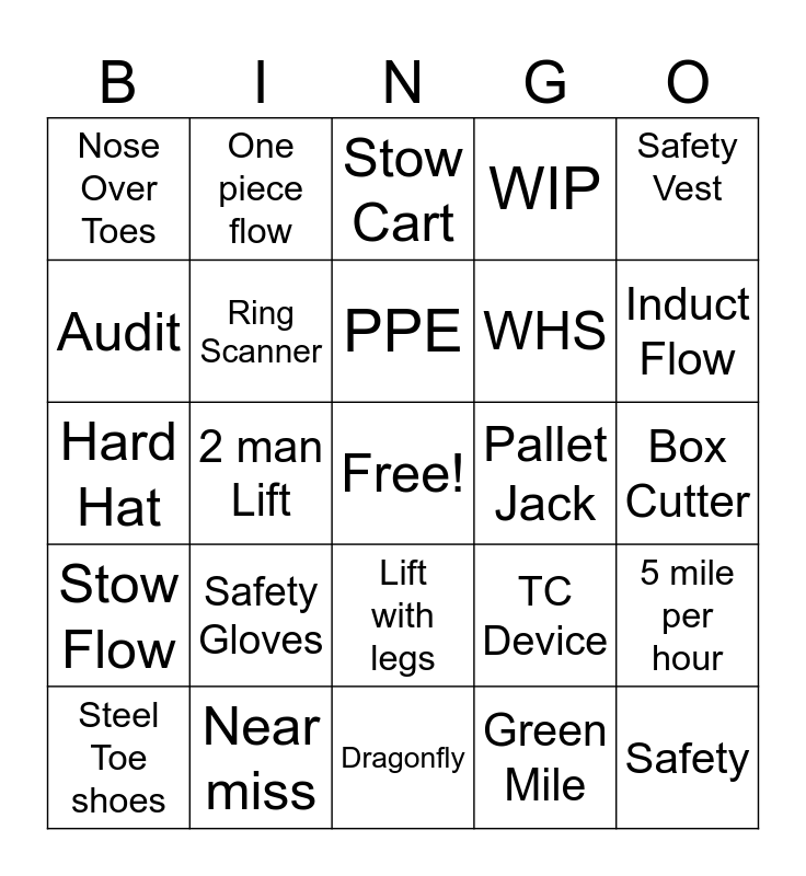 This bingo card has a free space and 24 words: Steel Toe shoes, Safety Gloves, PPE, Green Mile, Safety Vest, Nose Over Toes, One piece flow, Stow Cart, Pallet Jack, Box Cutter, Hard Hat, Ring Scanner, TC Device, 5 mile per hour, Audit, Near miss, Dragonfly, WIP, Induct Flow, Stow Flow, 2 man Lift, Lift with legs, WHS and Safety.