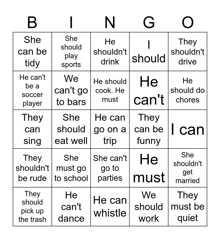 This bingo card has a free space and 24 words: She must go to school, He can't dance, He should cook. He must, They should pick up the trash, They shouldn't drive, She can be tidy, He can't be a soccer player, She should play sports, They can be funny, She can't go to parties, He can't, They can sing, He must, She shouldn't get married, We can't go to bars, We should work, I can, He shouldn't drink, He should do chores, She should eat well, They must be quiet, They shouldn't be rude, I should and He can whistle.