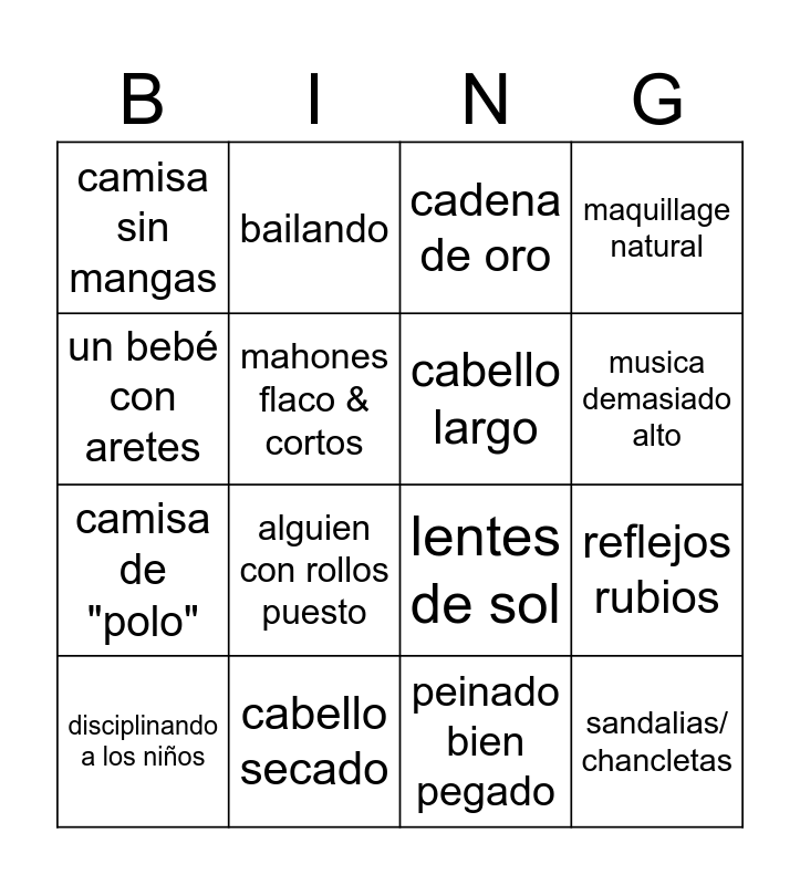 This bingo card has 19 words: lentes de sol, un calvo, cadena de oro, sandalias/ chancletas, reflejos rubios, un bebé con aretes, peinado bien pegado, camisa sin mangas, bailando, camisa de "polo", alguien con rollos puesto, mahones flaco & cortos, cabello largo, cabello secado, disciplinando a los niños, alguien delcalzo, maquillage natural, musica demasiado alto and jaylanie <3.