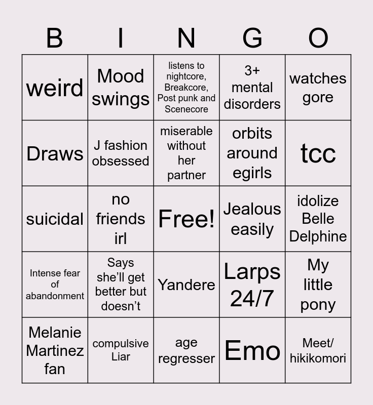 This bingo card has a free space and 24 words: Says she’ll get better but doesn’t, compulsive Liar, miserable without her partner, Melanie Martinez fan, watches gore, weird, Draws, Mood swings, Jealous easily, Yandere, orbits around egirls, suicidal, Larps 24/7, My little pony, J fashion obsessed, Emo, idolize Belle Delphine, listens to nightcore, Breakcore, Post punk and Scenecore, tcc, no friends irl, Meet/ hikikomori, Intense fear of abandonment, 3+ mental disorders and age regresser.