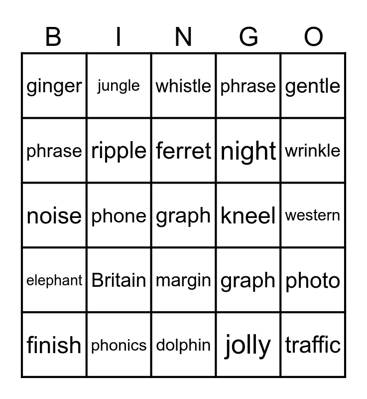 This bingo card has 25 words: Britain, dolphin, ferret, finish, gentle, ginger, phrase, jungle, kneel, margin, night, noise, graph, photo, ripple, traffic, western, whistle, wrinkle, phone, graph, phonics, elephant, phrase and jolly.