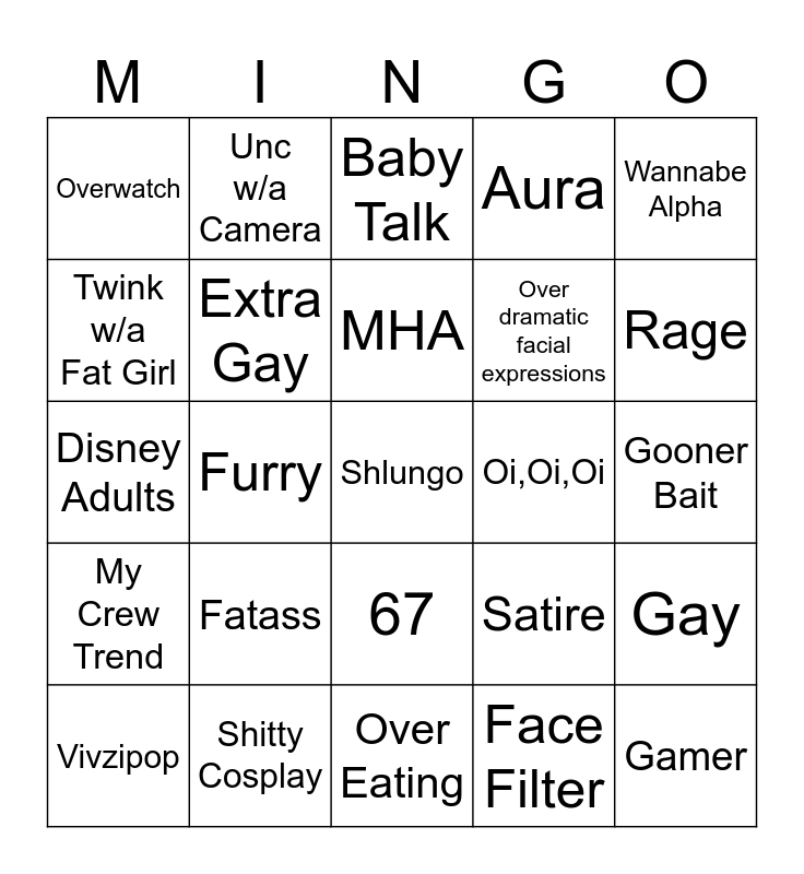 This bingo card has a free space and 24 words: Fatass, Shitty Cosplay, MHA, Vivzipop, Wannabe Alpha, Overwatch, Twink w/a Fat Girl, Unc w/a Camera, Oi,Oi,Oi, 67, Over dramatic facial expressions, Disney Adults, Satire, Gay, Extra Gay, Face Filter, Gooner Bait, Baby Talk, Rage, Furry, Gamer, My Crew Trend, Aura and Over Eating.