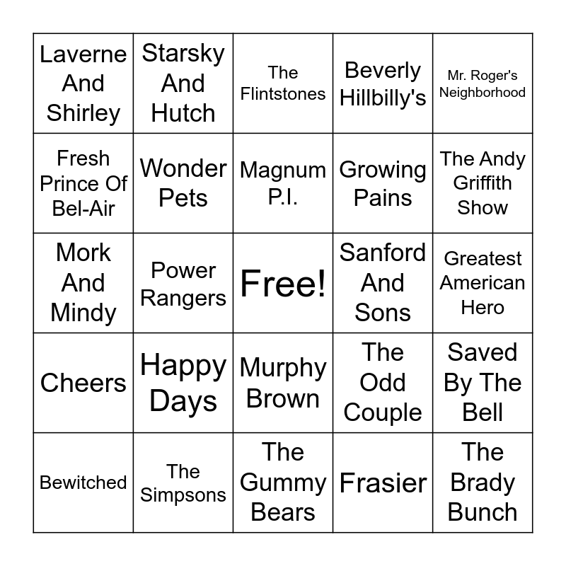 This bingo card has a free space and 104 words: Friends, Gilligan's Island, Mr. Roger's Neighborhood, The Adams Family, Green Acres, Mister Ed, I Dream Of Jeannie, Leave It To Beaver, I Love Lucy, Three's Company, Chips, The Partridge Family, The Walking Dead, Stranger Things, Big Bang Theory, Family Guy, The Flintstones, Sesame Street, All In The Family, Scooby Doo, Spongebob, Little Einsteins, The Tonight Show, Full House, Roseanne, Happy Days, The Andy Griffith Show, Beverly Hillbilly's, The Wonder Years, The Drew Carey Show, The Odd Couple, Frasier, Seinfeld, Beverly Hills 90210, M*A*S*H, Diff'rent Strokes, Miami Vice, Star Trek, Magnum P.I., The Simpsons, X-Files, Cheers, The Golden Girls, Fresh Prince Of Bel-Air, The Love Boat, Laverne And Shirley, The Office, The Brady Bunch, Jeopardy, Wheel Of Fortune, Fame, Knight Rider, The Cosby Show, Alf, Dallas, Dukes Of Hazzard, Who's The Boss, Murder She Wrote, Dynasty, Murphy Brown, Greatest American Hero, Teenage Mutant Ninja Turtles, Bob The Builder, Charlie's Angels, Transformers, Little House On The Prairie, The Muppet Show, Starsky And Hutch, Mork And Mindy, Power Rangers, The Gummy Bears, Chip And Dale Rescue Rangers, Darkwing Duck, Fraggle Rock, Phineas And Ferb, Duck Tails, Pinky And The Brain, Bewitched, Bob's Burgers, The Soprano's, Rick And Morty, Thunder Cats, Wonder Pets, Bonanza, Sanford And Sons, Columbo, The Jefferson's, Cops, The Bob Newhart Show, Flipper, Silver Spoons, Punky Brewster, Blossom, Saved By The Bell, Family Matters, Family Ties, Perfect Strangers, Growing Pains, Married With Children, Baywatch, Lassie, Animaniacs, Looney Tunes and Dawson's Creek.