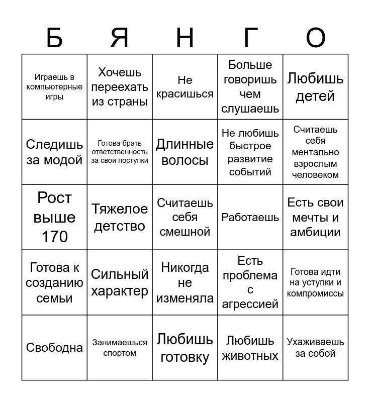 This bingo card has a free space and 24 words: Свободна, Сильный характер, Длинные волосы, Любишь животных, Любишь детей, Играешь в компьютерные игры, Хочешь переехать из страны, Не красишься, Работаешь, Есть свои мечты и амбиции, Рост выше 170, Готова брать ответственность за свои поступки, Есть проблема с агрессией, Готова идти на уступки и компромиссы, Следишь за модой, Занимаешься спортом, Любишь готовку, Больше говоришь чем слушаешь, Считаешь себя ментально взрослым человеком, Готова к созданию семьи, Тяжелое детство, Никогда не изменяла, Не любишь быстрое развитие событий and Ухаживаешь за собой.